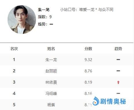 让我们再次恭喜朱一龙拿下第一(由于拢龙拿下多个榜单第一,导致小编要加一个“又”),虽然小公爷齐衡是《知否知否》里戏份并不多的配角,可演技出众的朱一龙赋予了齐衡新的生命,他让我们身临其境的感受到了元若哥哥的绝望和挣扎,前有完美演绎润玉的罗云熙,后有完美演绎齐衡的朱一龙,谁说配角没有春天?只要有演技,你就能赢得观众认可!
