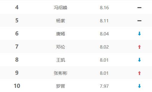 排在榜单第6~第10位的电视演员依次是主演《格子间女人》的唐嫣、与杨紫空降热搜的邓伦、主演《大江大河》的王凯、与林依晨合作新剧《小女花不弃》的张彬彬,以及与周冬雨合作新剧《幕后之王》的罗晋,其中演技得到观众肯定的“糖糖”唐嫣位列第六,虽然该剧已经收官,可唐嫣依旧保持着不俗的人气,“糖糖”未来可期。新的一周将至,电视演员的征程还在继续,你为谁打Call?