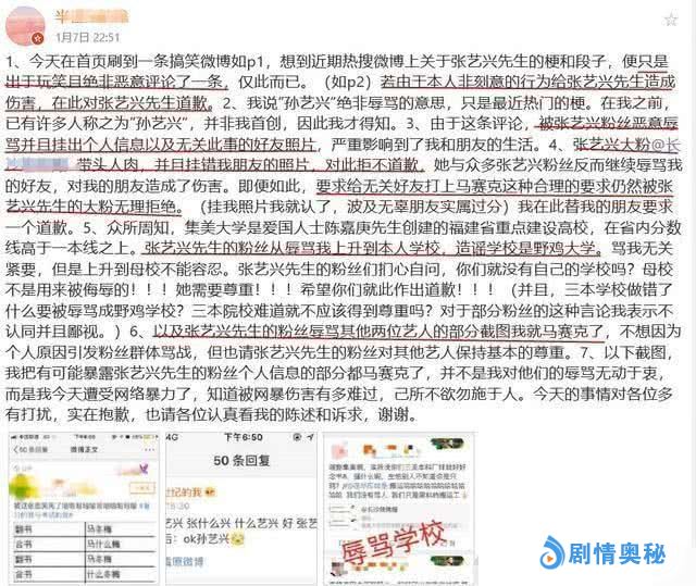 最后,这位自创段子的网友,不得已在网上公布道歉声明。首先,该网友表示,这个段子并非是自己原创的,只是在别的段子上加工了一下。其次,该网友也说了,这个段子没有什么恶意,只是一时兴起。对此,该网友表示道歉,但是也希望张艺兴分粉丝们,尊重自己的学校和朋友,因为这事和他们没关系。