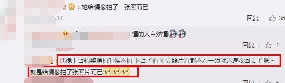最后也就是第三个细节,对于拿出手机后对着台上拍照的杨紫,有网友所说并不是为了看邓伦信息只是她给偶像拍照而已,有网友也反驳道:“偶像上台领奖摆拍时候不拍,下台了拍,拍完照片看都不看一眼迅速收回去?”