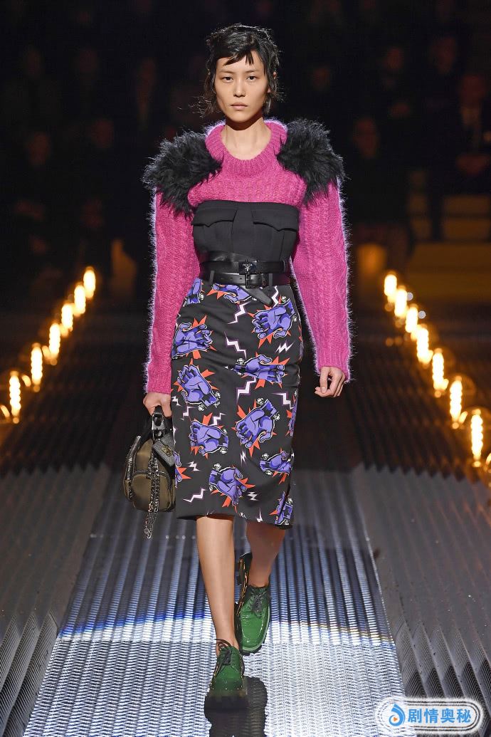 刘雯身穿一件毛衣连衣裙,上半身主要以玫红色毛衣,肩膀部分是两团黑色羽毛。下半身是黑色为主的修身裙,只是裙子还印有紫色手掌图案,鞋子是一双绿色运动鞋。穿搭并不是网友吐槽的重点,最让人审美无能的是刘雯的发型,凌乱的短发,额头还留着“人”字刘海,像极了一些老奶奶的发型。