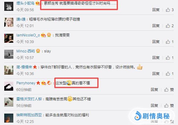 这样的造型刘雯凭着自己的气质感觉都不能完全驾驭,加上素颜,感觉刘雯都苍桑、老了10几岁呢!网友们也都纷纷留言:“素颜走秀,就是要搞得奇奇怪怪才叫时尚吗”、“穿白T都好看的人,竟然也有衣服穿不好看,设计师很牛”、“这发型真的看不懂”、“设计师的世界我不懂”……