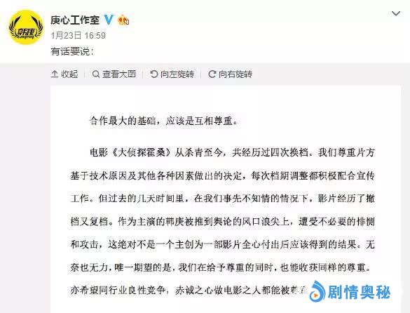 而对于主演韩庚而言,更是无奈,最后还通过工作室发文,希望片方给予多些尊重……等到今天这部《大侦探霍桑》总算上映了,结果却还是凉了,首日票房仅有三百多万,豆瓣评分还没出炉,不过从观众给出的影评来看,应该不会超过4分……