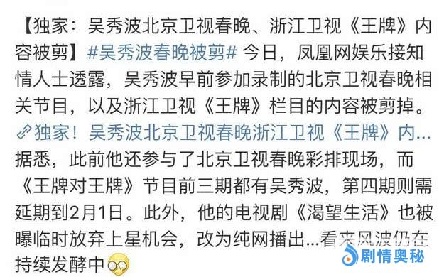 不仅如此吴秀波担任北京卫视春晚的主持人而且已经录制完毕了,而这次吴秀波的事件影响太大了据媒体曝光吴秀波的镜头已经全部被删掉了,除此之外《王牌对王牌》的前三期都有吴秀波的身影虽然关于吴秀波的镜头删尽了,但是《王牌对王牌》不得不推迟开播适当调整节目,邀请了一些艺人来补拍一些镜头。不过最可怜应该是baby了。