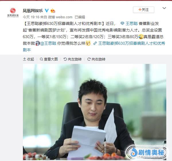 据凤凰网消息,近日,王思聪旗下的香蕉影业发起“香蕉新编剧圆梦计划”,宣布将发掘中国优秀电影编剧潜力人才。总奖金设置630万,一等奖1名150万;二等奖2名各120万;三等奖3名各80万。