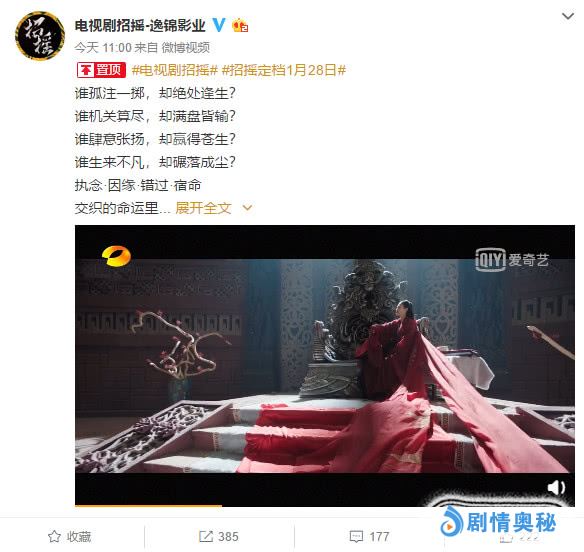 《招摇》正式定档1月28日湖南卫视开播,《知否》播完后的晚间剧场,没想到这部仙侠剧居然能够上星,期待到时候的爆红啦,你会来看吗?欢迎留言!