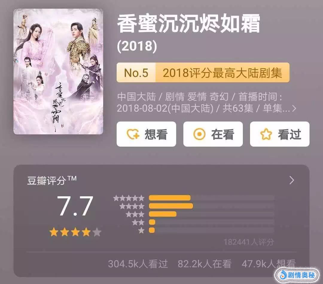 有超过18万人在豆瓣为《香蜜》打分,最终评分稳定在7.7分,在2018年电视剧高分榜上位列第五。