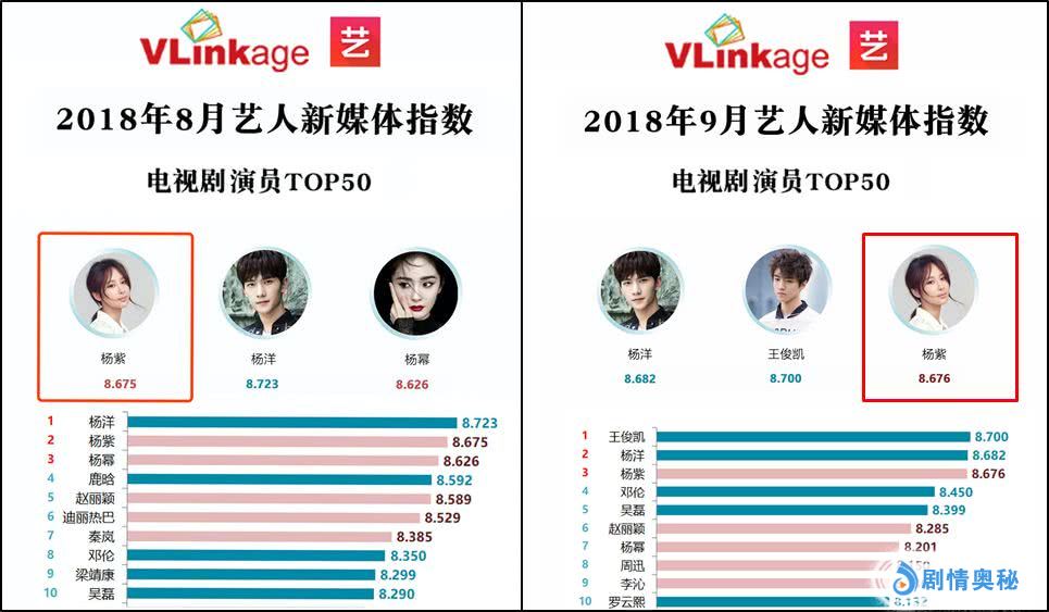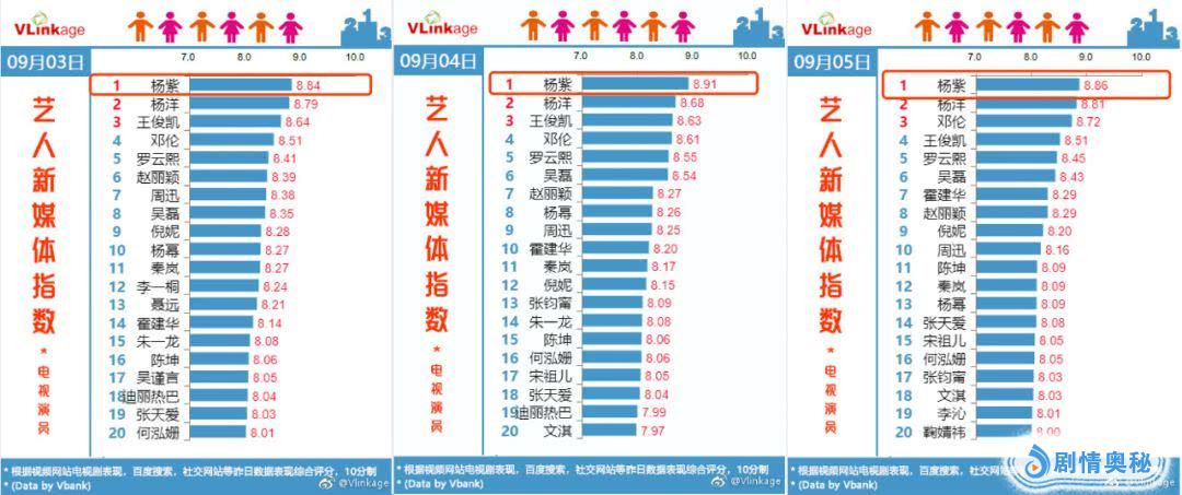 口碑一直很好的杨紫数据表现也十分亮眼。剧播期间V榜艺人新媒体指数连续登顶。8月月榜位列第2,9月月榜拿下第3。