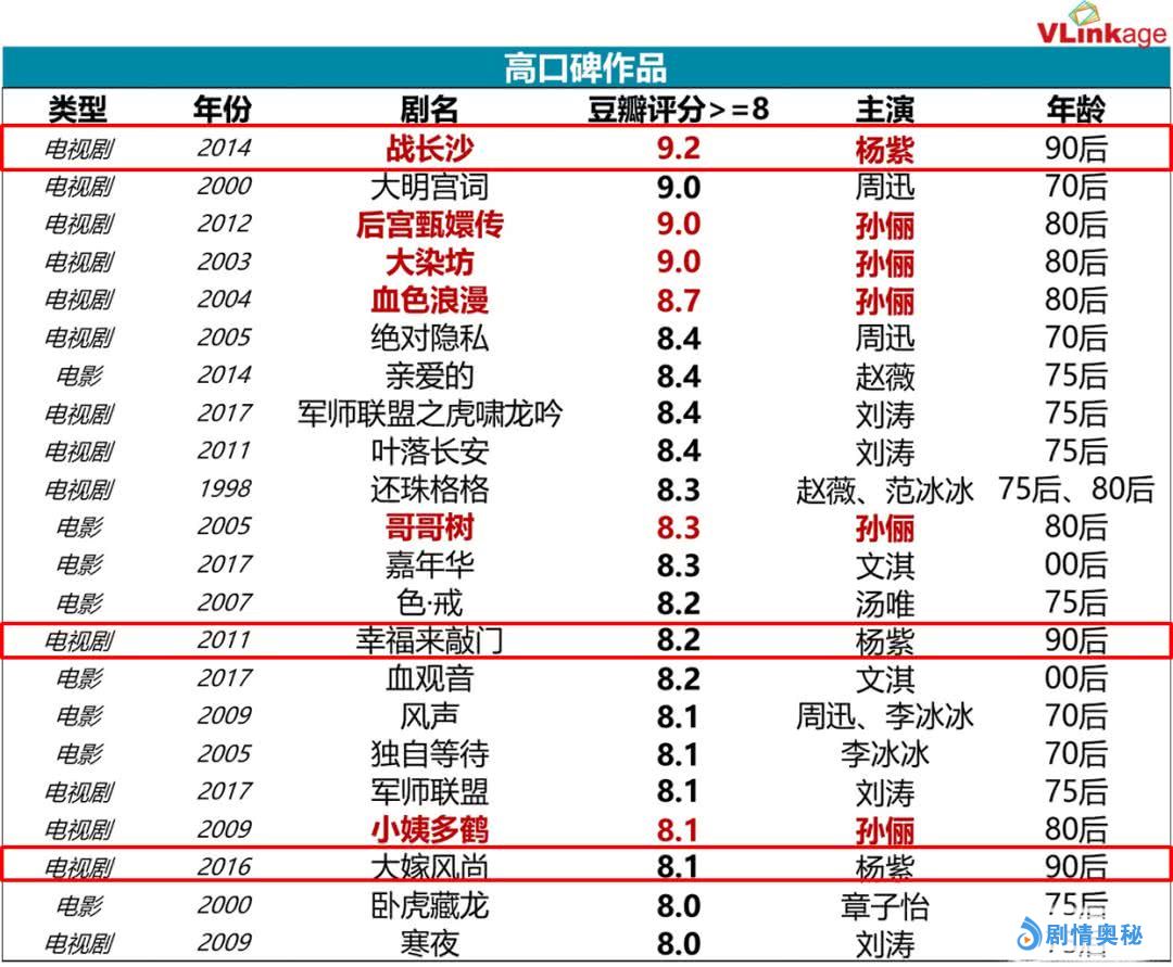 不仅如此,在Vlinkage11月23日发布的《演艺圈女演员图鉴》一文中,盘点了各年龄段代表性女艺人豆瓣评分超过8分的作品,其中杨紫的《战长沙》以9.2分登榜,登榜作品3部。可见杨紫在演技上发挥稳定,作品一直保持着极高的社会影响力,是90后小花中的佼佼者。