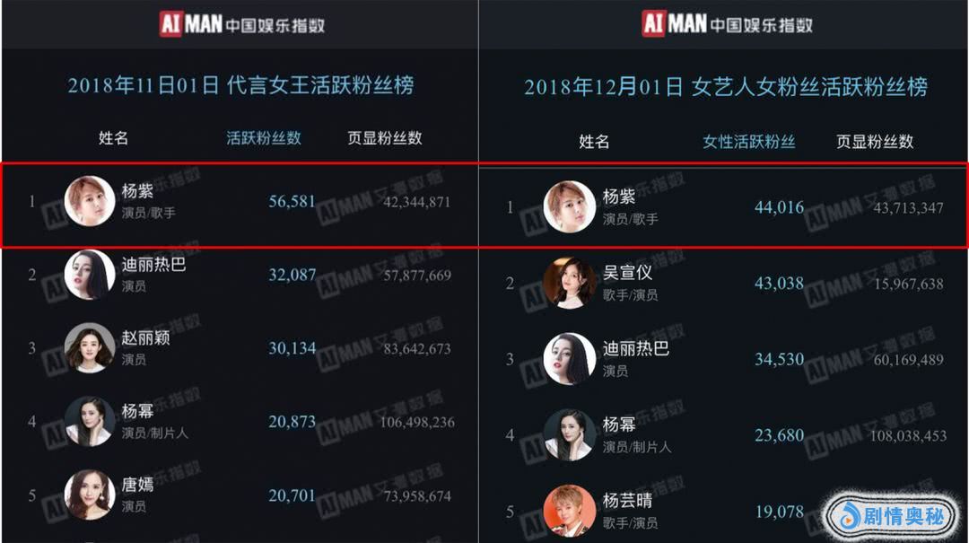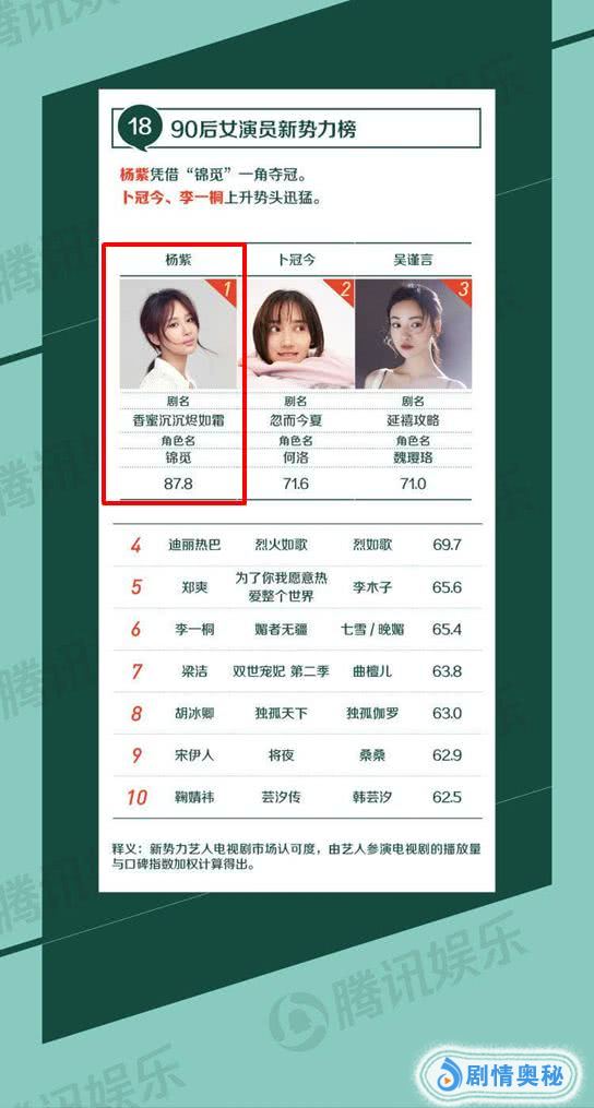 杨紫的年度数据榜单表现更是优秀,堪称演艺圈的“优等生”。2018年,杨紫凭借《香蜜沉沉烬如霜》中的锦觅一角,成为腾讯娱乐白皮书90后女演员新势力榜第一;