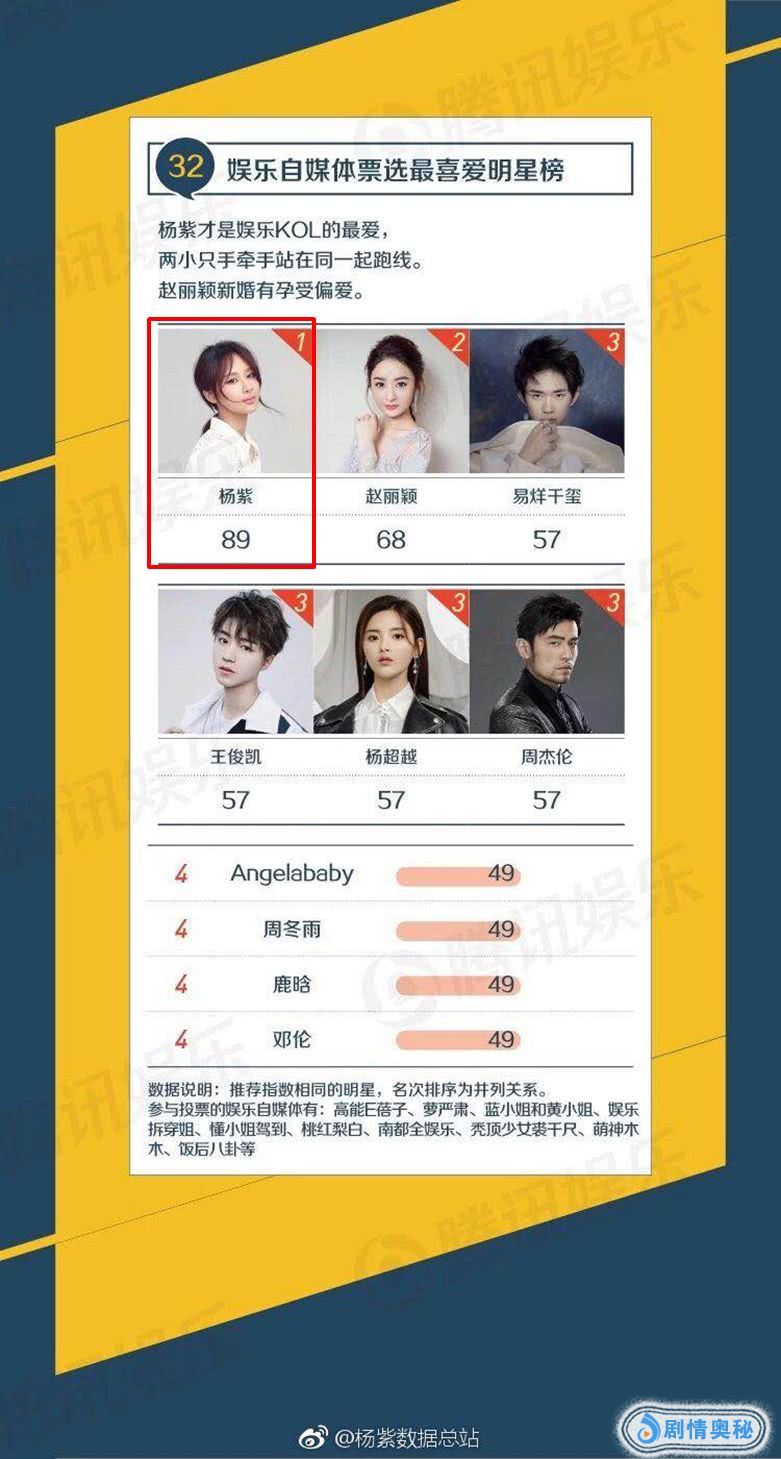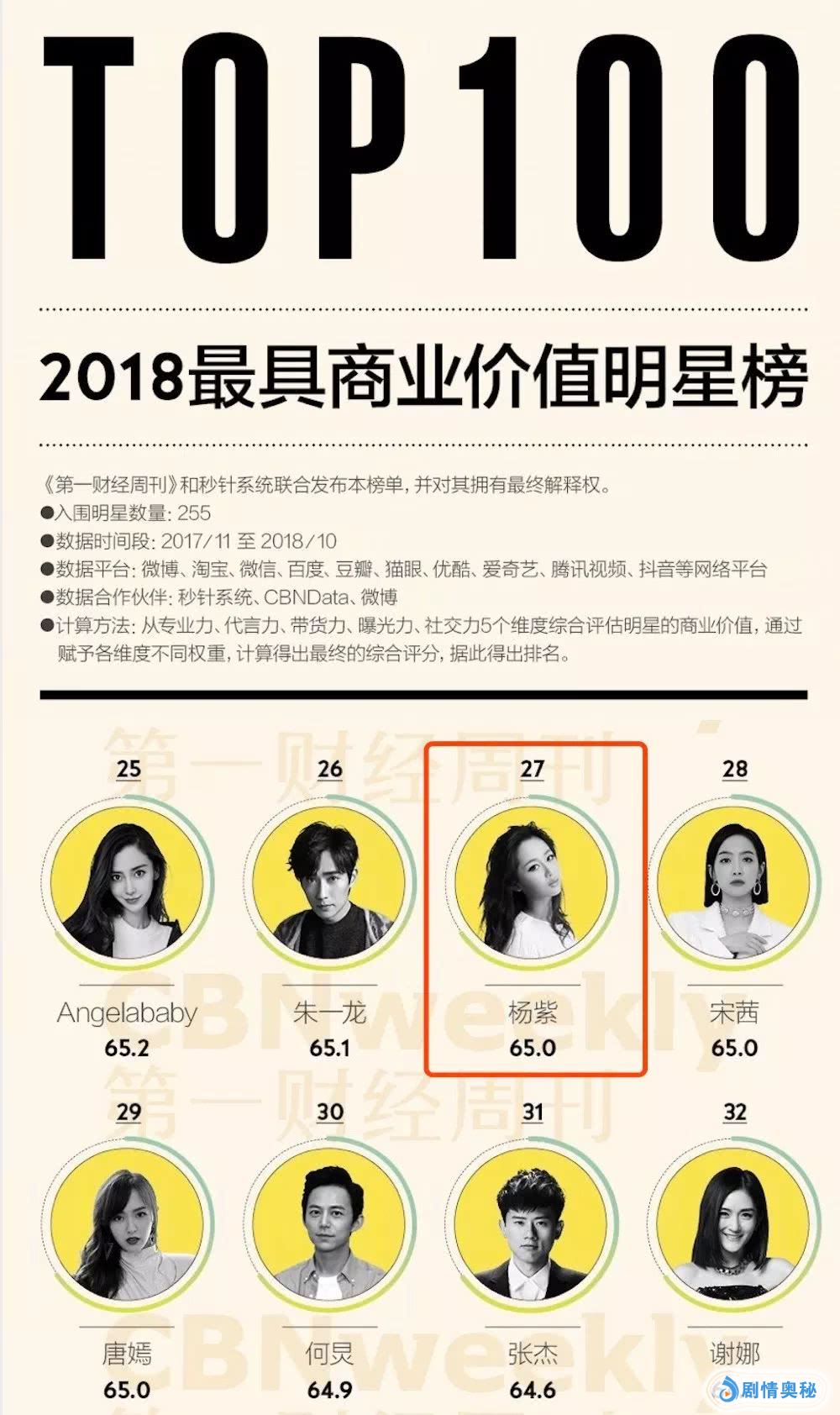 同时,在《第一财经周刊》发布的2018最具商业价值明星榜中,杨紫排行第27位,女艺人排行第9,90后女星排行第3。