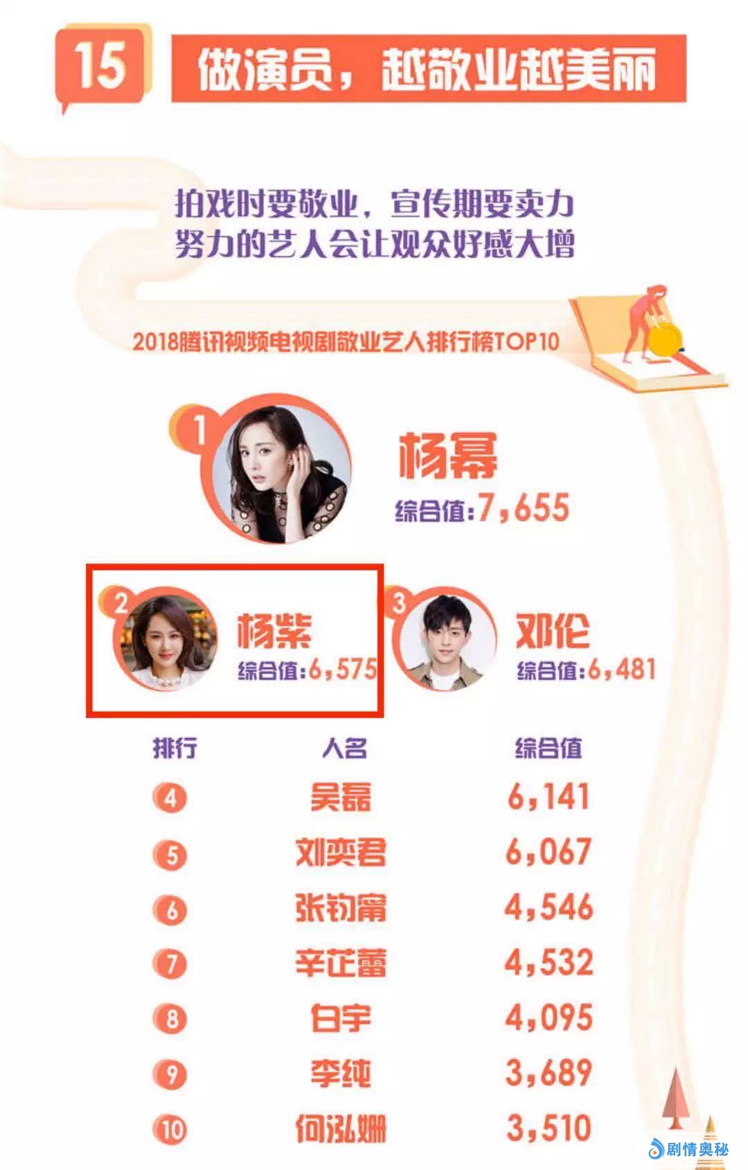 今年杨紫为了宣传新剧还上了热搜,被戏称“宣传委员”。拍戏时努力敬业,宣传期也认真对待的杨紫,获得了腾讯星光盛典敬业艺人排行第二。