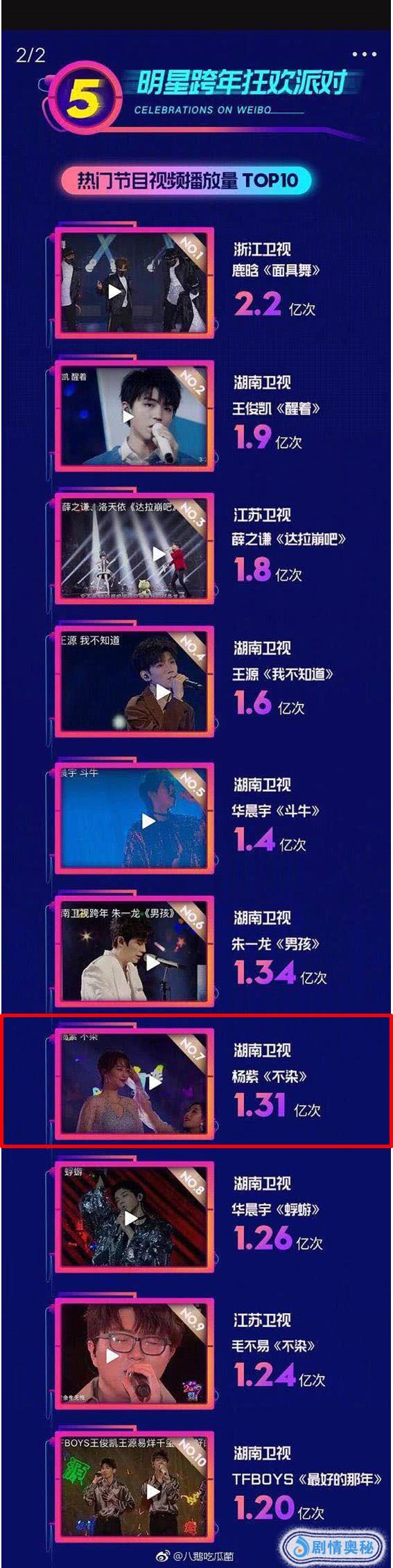 2018年年尾,杨紫参加了湖南卫视的跨年晚会,演唱了《香蜜沉沉烬如霜》的主题曲《不染》。这也是她首次参加跨年演唱会,但成绩却毫不逊色。每年的跨年晚会,观众调台忙个不停,各大电视台也在“暗自较劲”。在今年的“跨年大战”中,杨紫的表演视频播放量总排行第七,是唯一进前十的女艺人。想一想今年的跨年演唱会的阵容,杨紫的视频能进前十足见其号召力和影响力了。