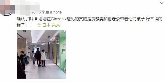 近日,有网友便在微博晒出日本偶遇贾静雯一家人的照片,并附文:“确认了眼神 刚刚在Ginzasix碰见的真的是贾静雯和他老公带着他们孩子,好幸福的样子!!”