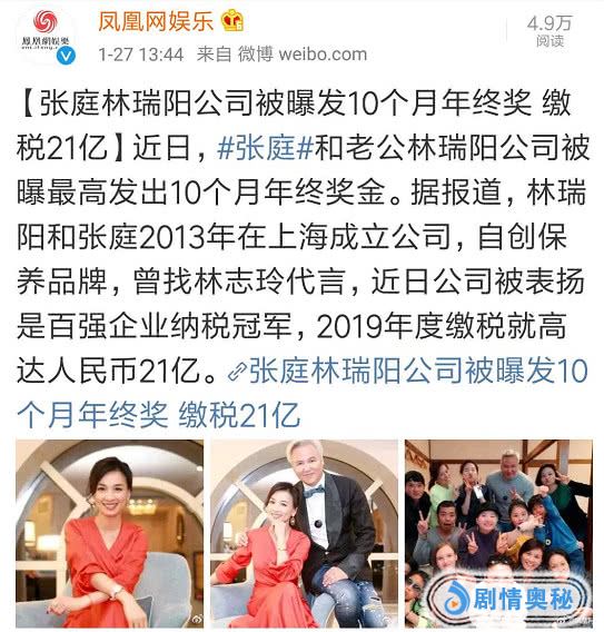 近日,张庭和林瑞阳名下的公司再次遭到质疑,原因是公司被曝仅2019年就已经缴税21亿,而且给员工发放的年终奖最高相当于10个月的薪酬。