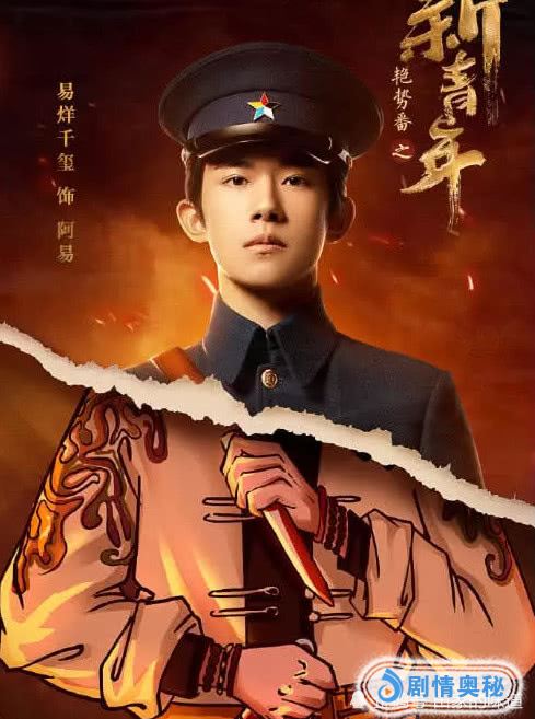 他在里面是一身军装,外面是一身这个旧款的戎装,手上还拿着刀!意思是他会从小的家仇,到大的国恨,成为救国的新青年!