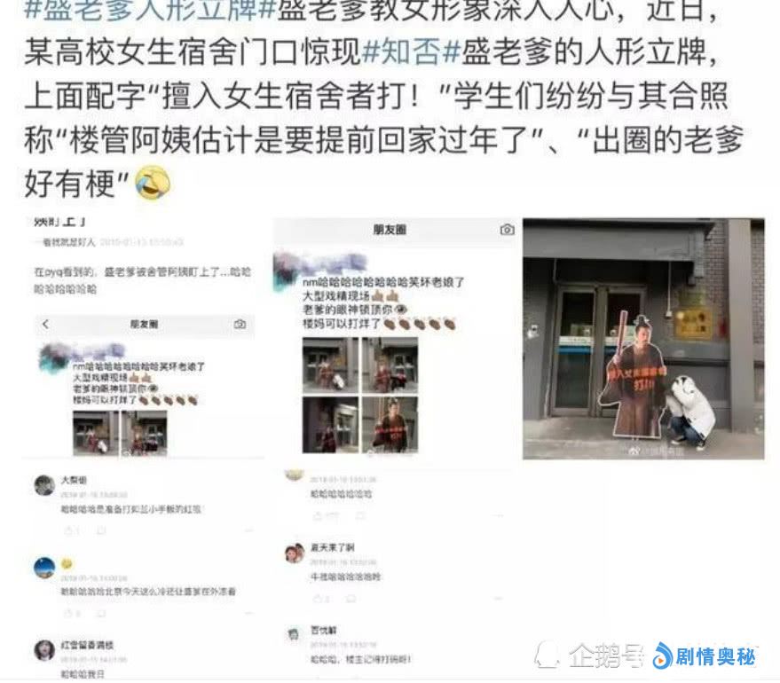 比如说,有一条很火的新闻,那就是有关于盛老爹的,有一个学校将盛老爹做了一个塑料的像,放在了女宿舍楼下,手里还拿着武器,并配着一段话,说要是进去女性宿舍的男同学就要被打了,这个可吸引了很多人的围观。