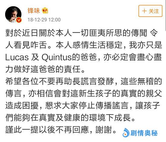 不久后又有传闻说张柏芝第三子的生父是前夫谢霆锋,结果谢霆锋亲自发博辟谣,在否认自己是第三子生父的同时,还不忘强调自己和女友王菲的感情非常稳定。