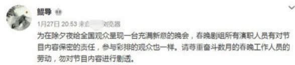 不过有去现场观看两人彩排的粉丝,透露了一些节目的细节。这也引起了一定范围的节目细节透露,也引起了春晚导演的回应。春晚导演发微博严肃斥责,表示春晚是给全国观众呈现一个充满新意的晚会,所有工作人员都有对内容保密责任,参与彩排的观众也一样,请尊重别人的劳动成果,切勿剧透。