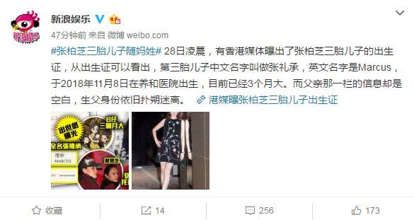 近日港媒曝光了张柏芝三胎儿子的出生信息,原本以为会在父亲一栏看到一些内容,但令人出乎意料的是,张柏芝三胎儿子的父亲一栏是空白的。而张柏芝三胎中文名取名张礼承,英文名字是Marcus,姓氏也是直接跟着张柏芝的姓,看来要想知道父亲确实有点困难了。