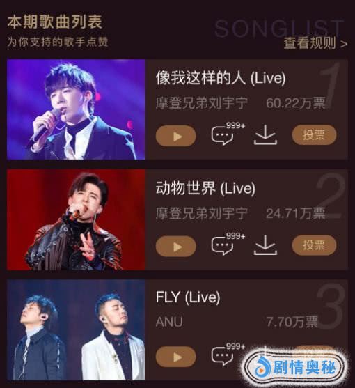 “殿堂级歌神”刘欢稳定发挥,将《带着地球去流浪》演绎出史诗效果;齐豫女神继续发力,《飞鸟和鱼》充满了对人生的理解!杨坤则凭借热情如火的《下个,路口,见》引爆全场,成功拿下现场投票第一名~