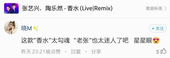 就像歌名一样,这首歌让人沉醉在香水般的音乐中。有人听完甚至忍不住在酷狗评论区大喊:“这款‘香水’太勾魂,‘老张’也太迷人了吧,星星眼”。