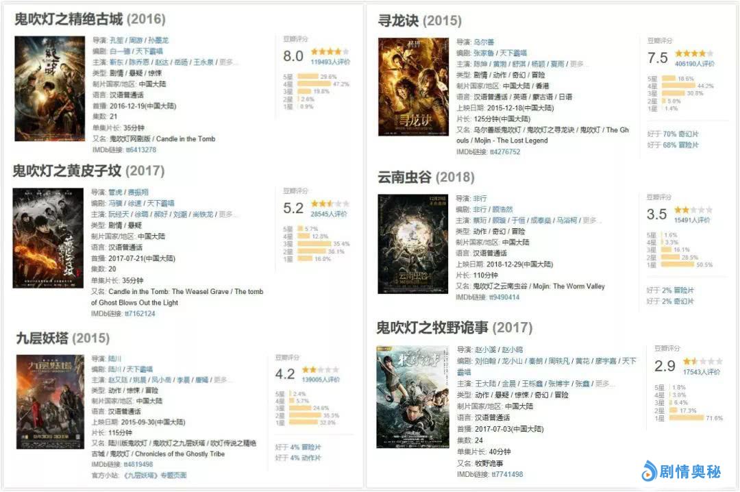 分析前几部成功的经验和失败的教训,我们不难看出,《精绝古城》和《寻龙诀》最大的优点分别在于制作精致和选角契合,且都比较贴合原著;而《黄皮子坟》《九层妖塔》等不是选角不符合人设就是剧情严重脱离原著,硬伤明显。
