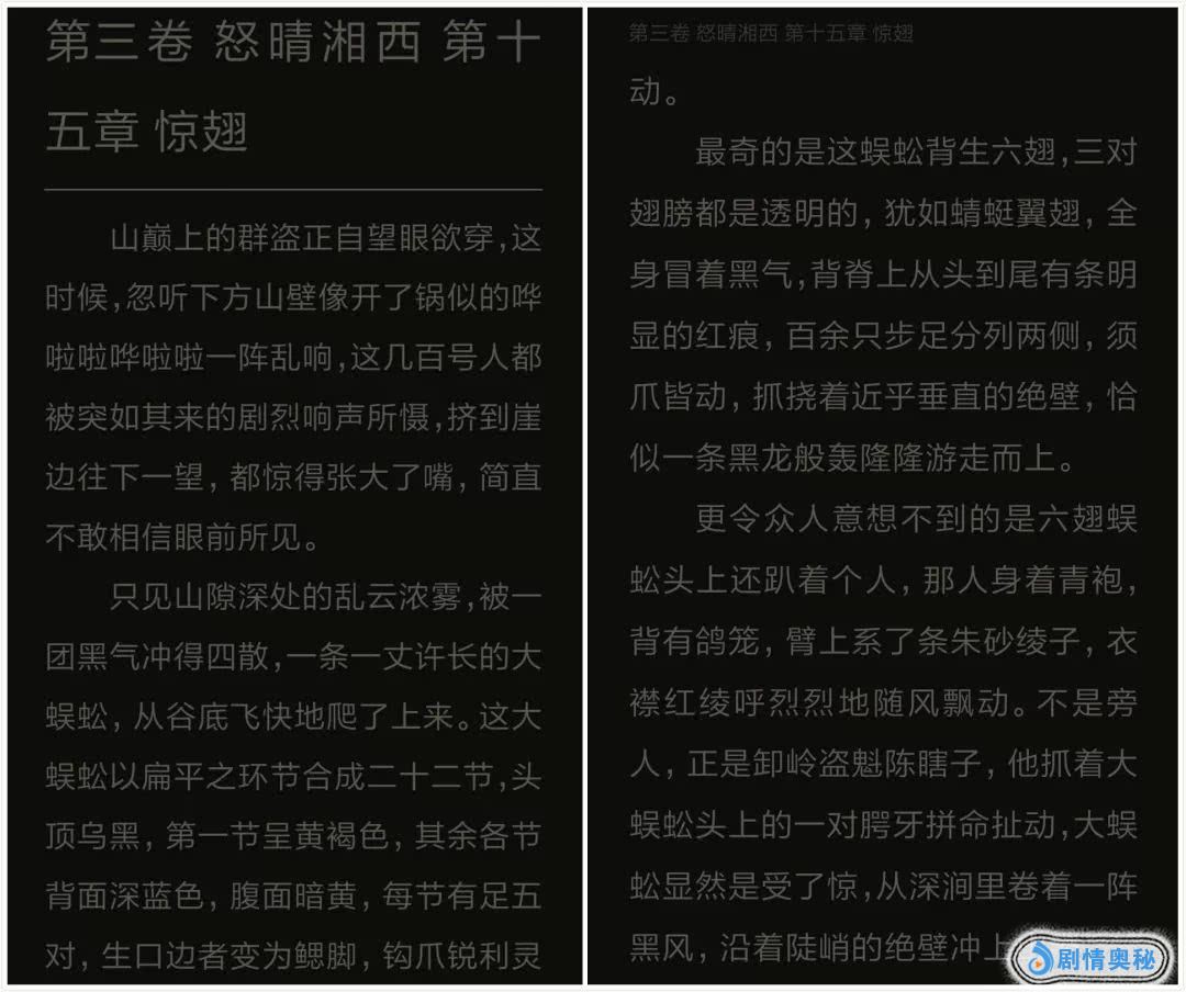 陈玉楼落入悬崖惊起了六翅蜈蚣那段,书中仔仔细细地写出了六翅蜈蚣的模样,还有陈玉楼和蜈蚣的打斗桥段。