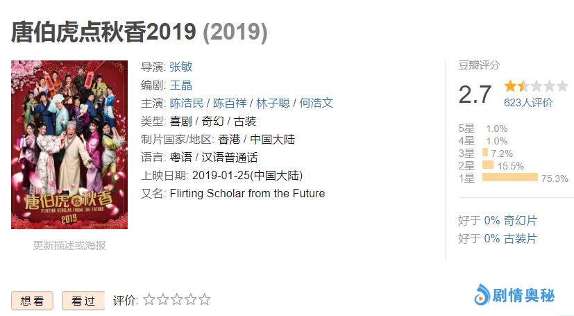 《唐伯虎点秋香2019》上映不久,豆瓣评分也出来了,仅仅给了2.7分,4天的时间只有600多人参与评分,一星占比率高达75.3%,已经不能用不及格来形容它了,完全是烂片的水平,不过这个结果反倒是印证了王晶烂片之王的称号。