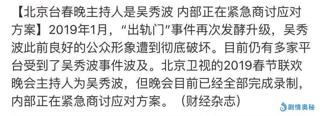 很多人说,《渴望生活》或许会变成网络剧播出了,和唐嫣正在拍摄的《无名侦探》可能会面临停播,北京卫视的春晚现在还不知道怎么办,还有他参加的节目现在也都正在想办法采取措施,感觉这一次真的是身败名裂的感觉了。不过也有很多人说,为什么吴秀波打上了马赛克,文章呢?