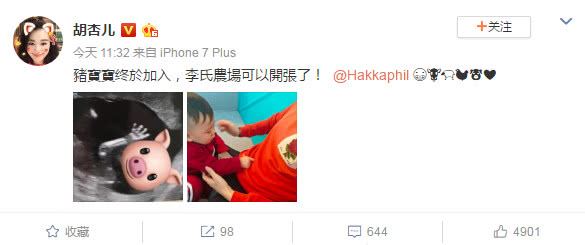 并且在1月29日上午11点多胡杏儿更是更博宣布:猪宝宝正式加入,李氏农场可以开张啦。并且配上两张可爱的图片,宣告怀上二胎。看来胡杏儿怀孕已经有一段时间了,出生之后应该就是一个猪宝宝了。此次胡杏儿的公开,也是不忘秀恩爱啊,直接说到,李氏农场开张。