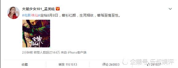 不仅如此这次《诛仙》导演组还邀请了孟美岐和李沁两人顶级流量明星主演,李沁饰演“陆雪琪”一角,而孟美岐则是饰演“碧瑶”。孟美岐凭借《创造101》综艺节目大火,通过自己的努力成为火箭少女团成员之一,在女团当中孟美岐是C位出道。论才艺孟美岐实至名归,可是论演技的话网友们都十分担心,自《诛仙》开拍时导演让孟美岐饰演“碧瑶”一角的时候,网友们都担心孟美岐会毁掉赵丽颖版的“碧瑶”经典形象。