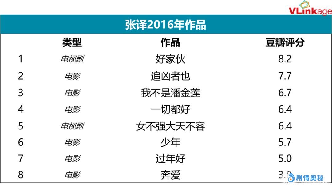 作品爆发力同样不容小觑的是公认的演技派张译,2016年作品数量高达8部,其中6部均为电影,2016年是其转战大荧幕的转型期,创作力惊人,但口碑参差不齐。