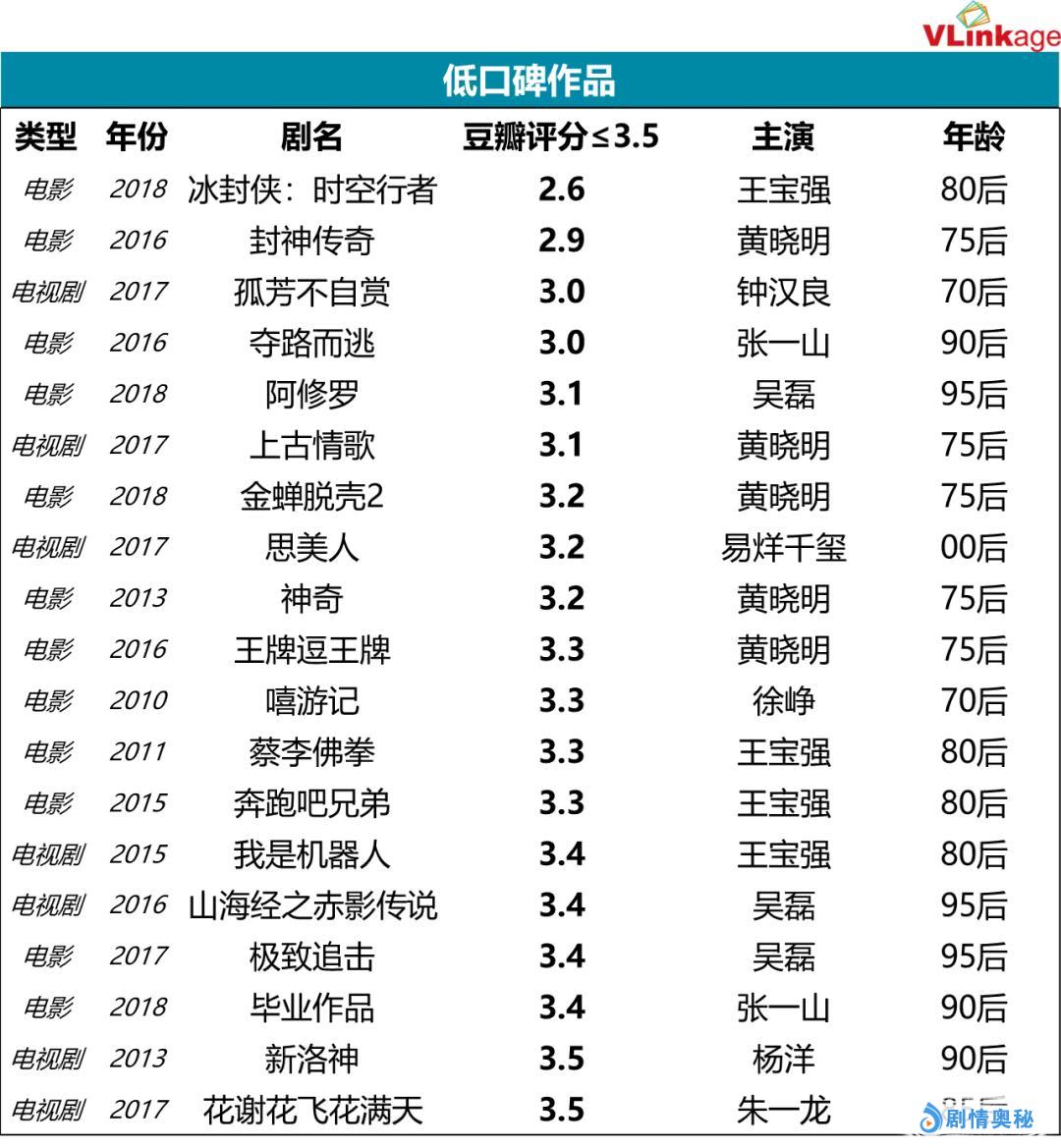 下图为这些男演员的作品里,豆瓣评分低于3.5分的作品。豆瓣评分排倒数第一的为80后王宝强,《冰封侠:时空行者》豆瓣评分仅有2.6分,其次为75后演员黄晓明,其作品《封神传奇》为2.9分;紧随其后的是70后演员钟汉良,豆瓣评分3分的《孤芳不自赏》成为其职业生涯口碑最差的作品。