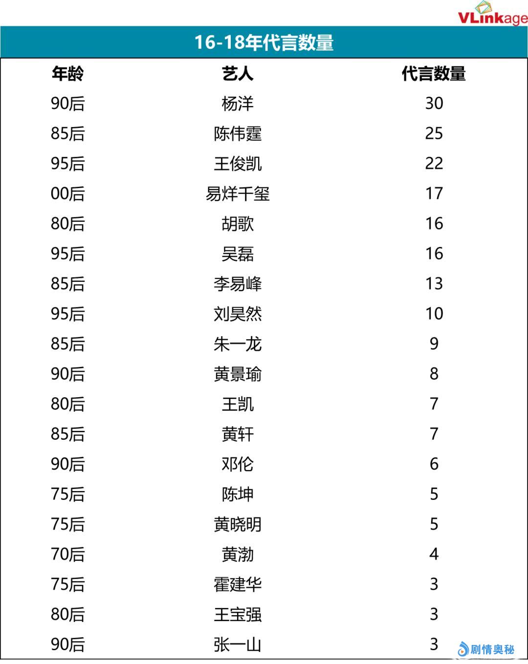演员的品牌代言数量与商业价值挂钩,能直观体现艺人在各个领域的综合影响力。在2016年到2018年间,代言数量最多的为90后演员杨洋,品牌代言数量高达30个;其次为85后演员陈伟霆,代言数量为25个;然后是95后演员王俊凯,代言数量为22个。