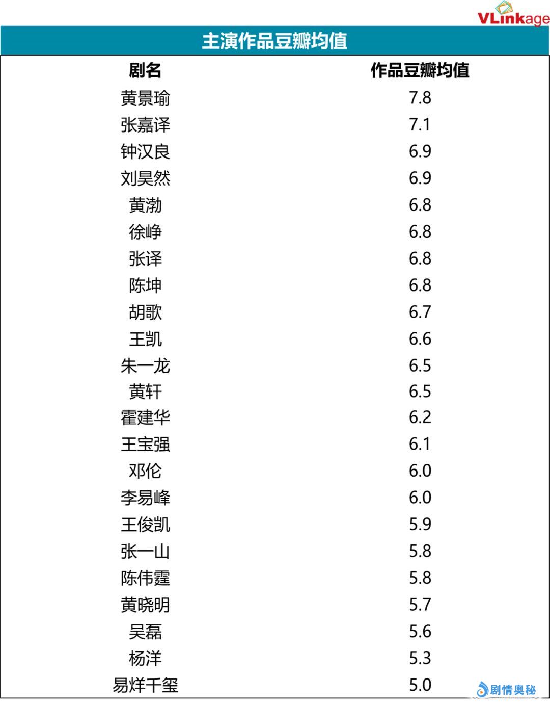 下图为这些演员的作品豆瓣均值,可以直观看到,均值最高的为黄景瑜,作品数量不多,但口碑表现都不错,豆瓣均值达到了7.8分;其次为高产又高质的张嘉译,94部作品能取得7.1分的口碑均值尤其难得。