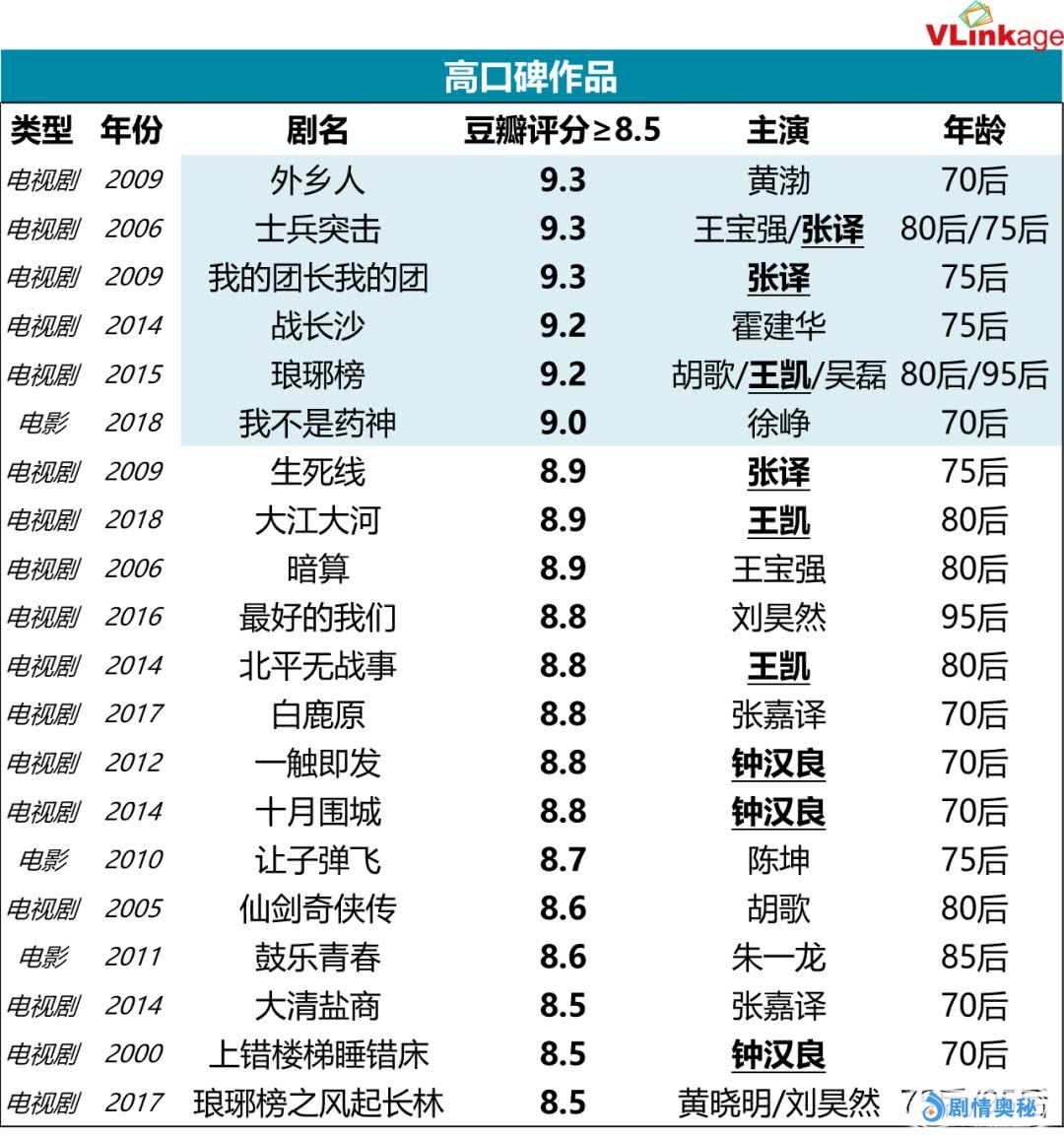 但他们同样也有着各自不同的特性,比如80后演员胡歌商业价值与90后相比毫不逊色,80后演员朱一龙创作爆发力与70后张嘉译不相上下,90后演员黄景瑜作品数量不多,但每部都口碑较高,等等。