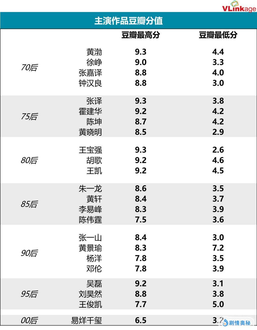下图为这些演员作品的豆瓣最高分和最低分表现,作品整体表现最好的为90后黄景瑜,作品最高分8.3分,最低分也有7.2分;差异最大的为80后演员王宝强,最高分9.3分,最低分仅有2.6分。