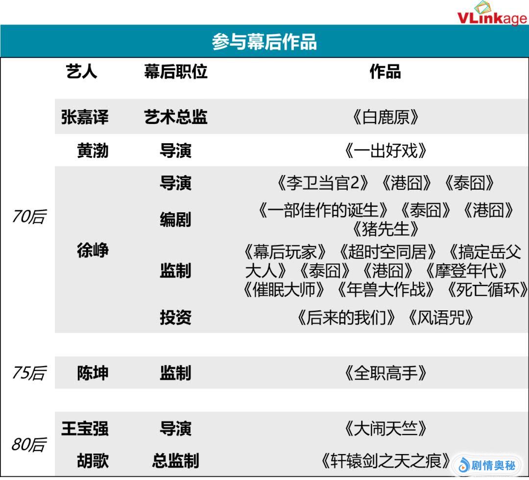 除了在职业领域的作品表现,不少男演员将精力放在幕后和商业领域,且取得了不错的成绩。下图为转型幕后的男演员以及他们参与制作或运作的影视剧作品,这些台前幕后都能兼顾的演员以34+以上的70后、75后、80后为主,多年的剧组经验和资源,以及丰富的人生阅历,都是他们能参与影视剧制作的原因。