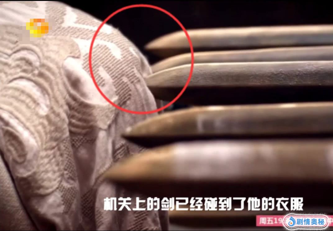 穿帮镜头二:少羽进了一个迷宫里面,里面重重机关,请大家注意这时机关上的剑已经碰到了他的衣服。我们可以非常清晰的看到。