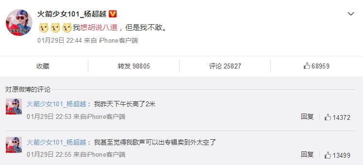 但是这个奖项又让杨超越黑上了热搜,面对网友们的质疑杨超越选择了沉默。杨超越曾在《吐槽大会》上自黑自己唱破音《卡路里》,不过她也表示自己会更加努力成为粉丝心目中的偶像的,如今一年的时间快过去了,杨超越终于忍不住压力想宣泄一下,昨晚杨超越再次发文称:想胡说八道,但是却不敢!虽然说不敢,但是杨超越还是连发了八条“胡言乱语”,“我昨天下午长高了2米”、“我甚至觉得我歌声可以出专辑卖到外太空了”、“我有时候想吃唱歌难听的小孩,可是我早上起来我自己不见了。”等等引起了网友们热议。