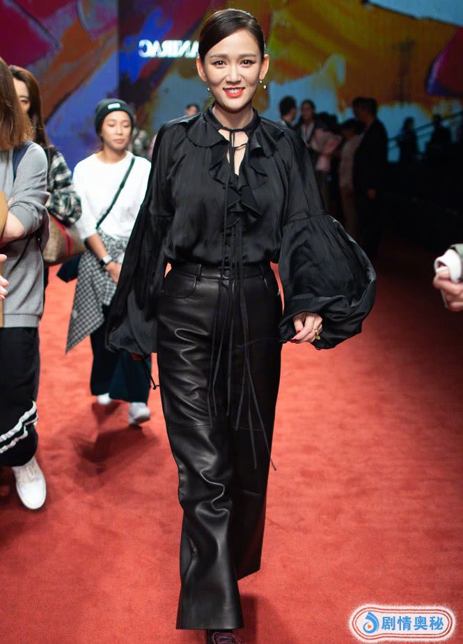 陈乔恩还有这样的打扮,她穿了一件黑色的雪纺上衣,比较简单的感觉,搭配了一条黑色的皮裤,看着比较保暖的感觉,虽然是一身黑色,但仍然是超级时尚的,搭配白色的耳环,增加了光泽感。