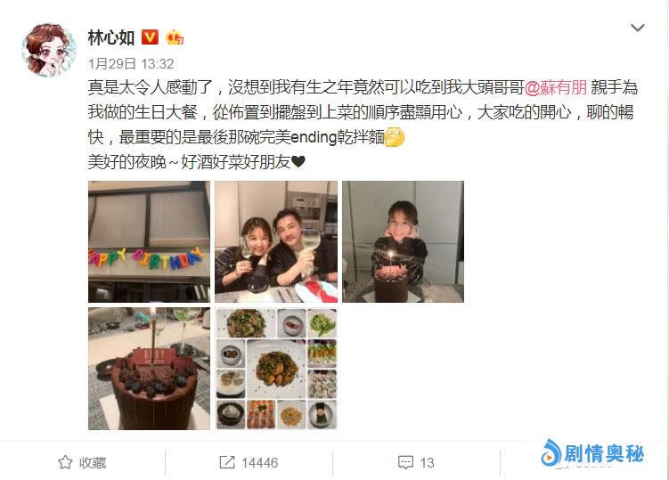 1月29日,是林心如的43岁的生日,而她随后她也更新了自己的个人动态,原来生日的当天,林心如没有跟霍建华以及女儿在一起,而是跟苏有朋一起过了生日。她还感慨在有生之间还能吃到大头哥哥给自己做的生日大餐,并且直言:“好酒好菜好朋友!”,可见苏有朋对林心如来说是一个非常最重要的人。