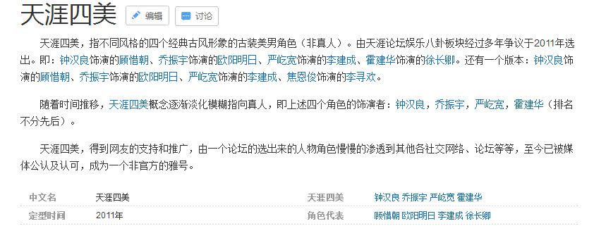 严屹宽、钟汉良、乔振宇、霍建华四人的古装扮相俊美飘逸,在2011年,被网友评为“天涯四美”。当然这个“四美”主要指的是他们扮演的角色。在小生层出不穷的今天,涌现出了不少新的古装男神,网友们一共推荐了五组人选,你的爱豆上榜了吗?