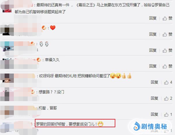 对于罗晋这个回答,网友也纷纷留言表示:“罗晋的回答好机智,要想套话没门儿”、“哈哈,罗晋自己都为自己机智转移话题笑起来了。”