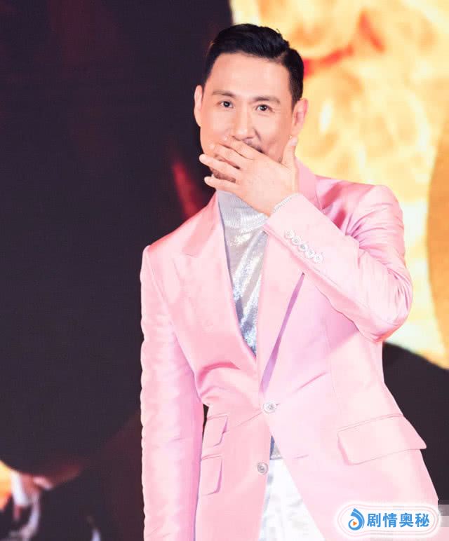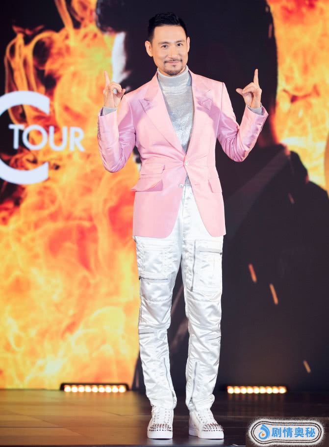 张学友穿着一件粉色的西装,十分少女的颜色,穿在他的身上简直了,他的身材是超级好的,而这套衣服穿在他的身上特别适合,在里面搭配的是银色亮片衣服,看着比较潮流的感觉。
