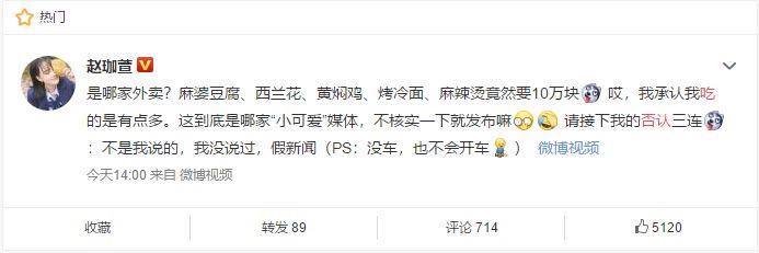 1月30日下午2:00,赵珈萱发微博回应“吃天价早餐”传闻,微博原文称:“是哪家外卖?麻婆豆腐、西兰花、黄焖鸡、烤冷面、麻辣烫竟然要10万块 哎,我承认我吃的是有点多。这到底是哪家“小可爱”媒体,不核实一下就发布嘛 请接下我的否认三连:不是我说的,我没说过,假新闻(PS:没车,也不会开车)”