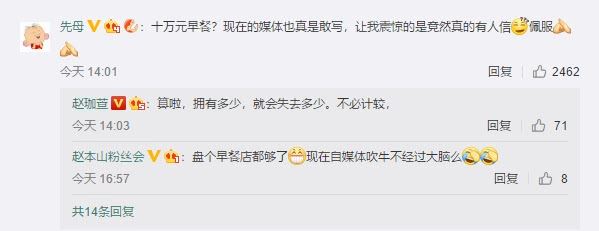 有网友在其微博评论区评论称:“十万元早餐?现在的媒体也真是敢写,让我震惊的是竟然真的有人信佩服”赵珈萱回应称:“算啦,拥有多少,就会失去多少。不必计较,”