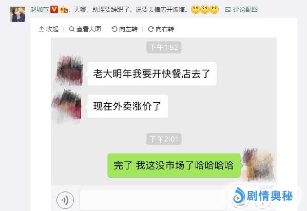 甚至还在评论区晒出了与助理调侃的聊天记录。称“天哪。助理要辞职了。说要去横店开饭馆”还调侃自己这边没市场了!!!