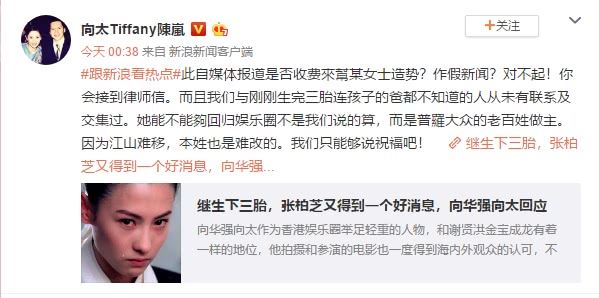 1月28日,一篇名为《继生下三胎,张柏芝又得到一个好消息,向华强向太回应》的文章中写道:“当年张柏芝因为耍大牌而被向华强向太直言封杀永不联系,但是时隔10年,张柏芝继生下三胎回归娱乐圈,这次又得到一个好消息,向华强向太直言张柏芝可以回到娱乐圈!”